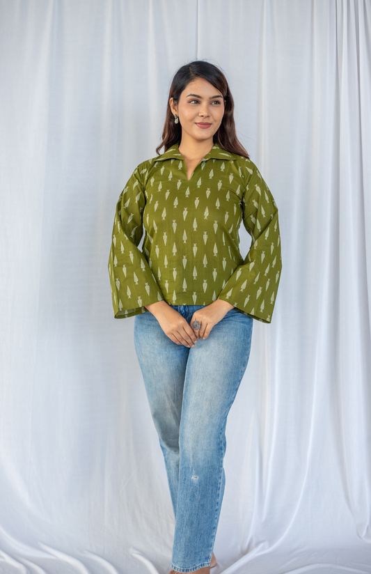 Olive Green Leaf Print Notch Collar Top with Bell Sleeve