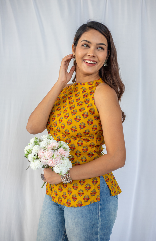Mustard Yellow Ajrakh Print Halter Neck Top with Tie-up back