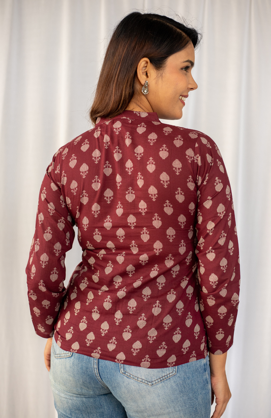 Wine Leaf Print Tie-up Neck Cotton Top
