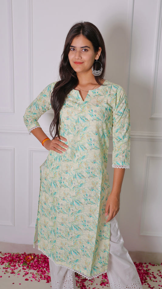 Leafy Luxe Embroidered Kurti & Cut-work White Pant Set