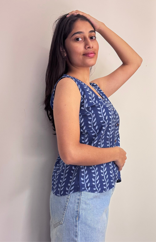 Indigo Leaf Print Sleeveless Waistcoat Style Cotton Top
