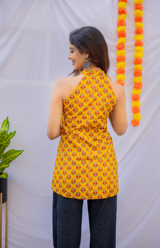 Amethyst Floral Print Halter Neck Cotton Short Kurti
